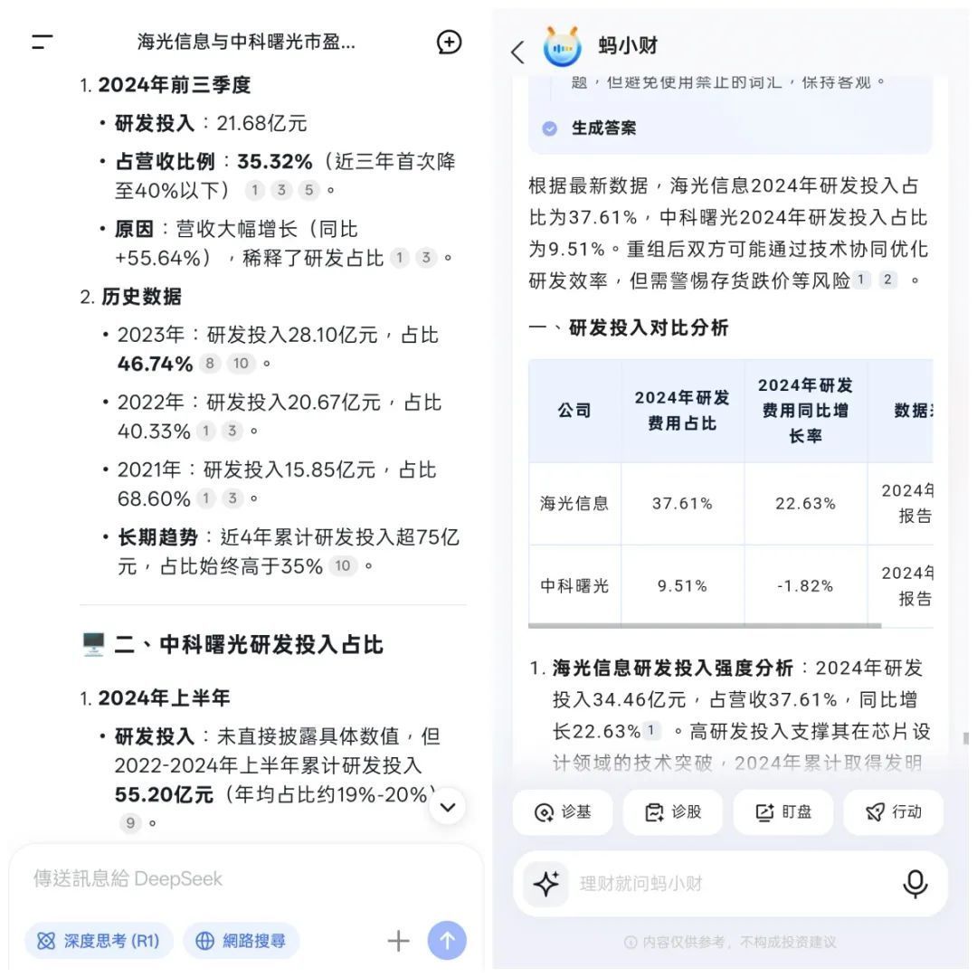 我还问了中科曙光和海光信息战略重组的事,来测试 AI 对热点事件的解读能力。从回答结果来看,DeepSeek 和蚂小财都能系统地解释两家公司重组的影响路径。但也同样是在数据获取上存在一定的差异,Deepseek 只找到了 2024 年部分季度,而不是全年的营收及研发投入数据。