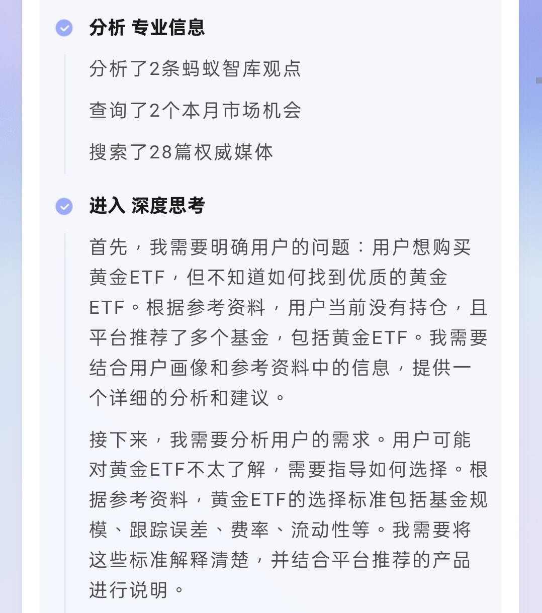 显而易见的是,在这类需求上,专业的理财 AI 普遍做得更好,测试发现不管是蚂小财还是妙想(东方财富)都能找到准确、实时的基金数据。蚂小财甚至从一开始思考就结合了我的持仓和风险偏好,指出哪些黄金 ETF 在规模、成本、波动率上更适合我当前的投资习惯。推荐结果不再是千人一面,而是根据个人画像精准筛选。