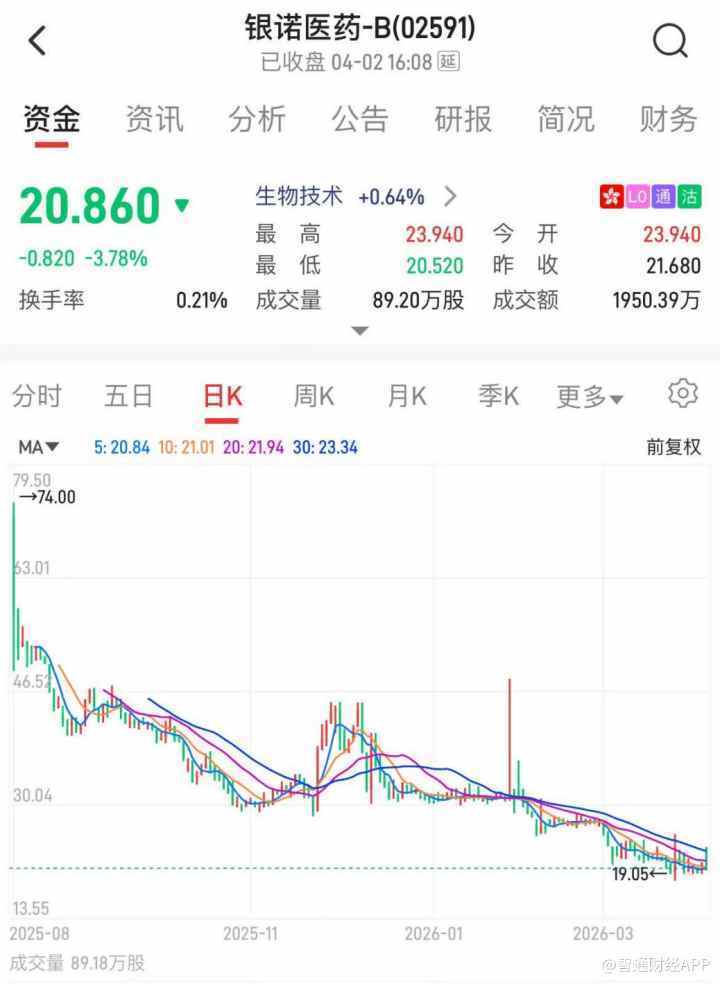 资本市场层面,银诺医药股价表现反映出市场对其投资的审慎态度。该股自上市初期创下74港元的历史高点后,呈现震荡下行态势,截至2026年3月24日,盘中一度下探至19.05港元,较历史高点最大跌幅超74%。截至2026年4月2日收盘,公司股价报20.86港元,年内跌幅达31.92%,市场信心仍需进一步修复。
