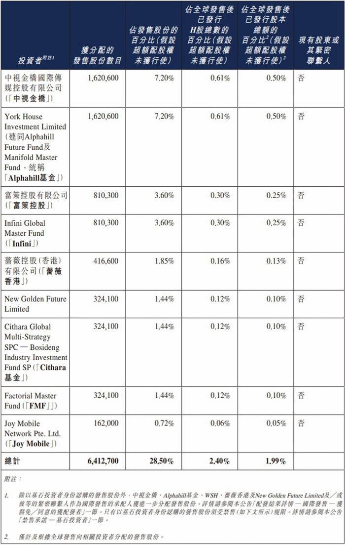 迅策本次发行的基石投资者为中视金桥国际传媒控股有限公司(「中视金桥」)、York House Investment Limited(连同Alphahil lFuture Fund及Manifold Master Fund,统称「Alphahill基金」)、富策控股有限公司(「富策控股」)、Infini Global Master Fund(「Infini」)、蔷薇控股(香港)有限公司(「蔷薇香港」)、New Golden Future Limited、Cithara Global Multi-Strategy SPC — Bosideng Industry Investment Fund SP(「Cithara基金」)、Factorial Master Fund(「FMF」」)、Joy Mobile Network Pte. Ltd.(「Joy Mobile」)。