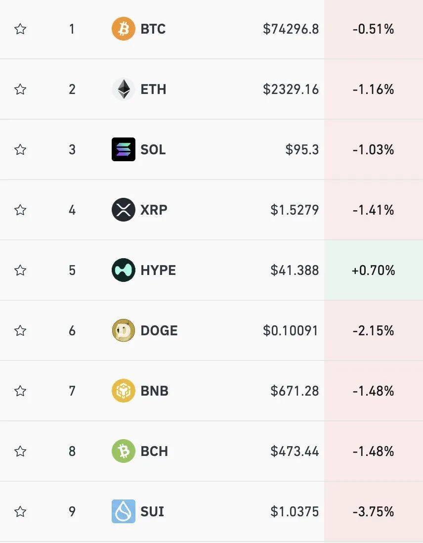 加密货币小幅回调,比特币报74296美元,日内跌0.51%,以太坊、SOL、狗狗币等均下跌。