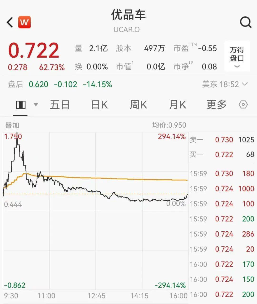 中概股优品车盘中大涨,最高涨近300%,并多次触发熔断,截至收盘涨幅报62.73%。